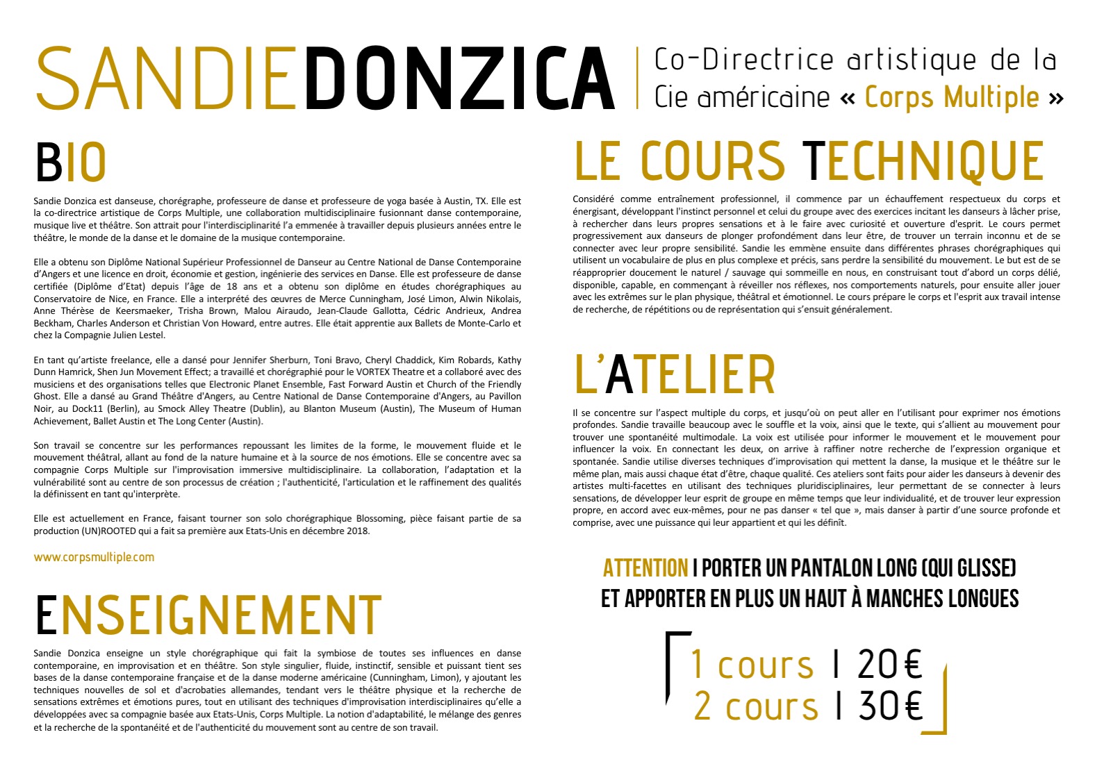 Sandie Donzica teaches a choreographic style that is the symbiosis of all her influences in contemporary dance, improvisation and theater. Her singular, fluid, instinctive, sensitive and powerful style is based on French contemporary dance and modern American dance (Cunningham, Limon), adding new techniques of German floorwork and acrobatics, tending towards physical theater and research of extreme sensations and pure emotions, while using interdisciplinary improvisational techniques that she developed with her US-based company, Corps Multiple. The notion of adaptability, the mixing of genres and the search for the spontaneity and authenticity of the movement are at the center of her work.